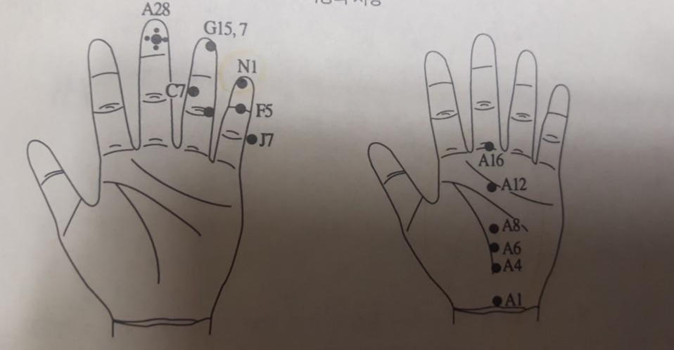 이럴 때는 아래의 그림과 같이 손의 위치에 서암봉을 붙이거나 서암뜸 또는 수지침을 놓습니다.