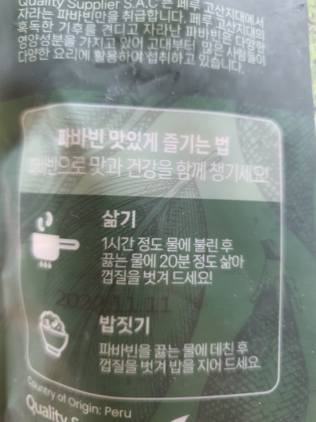 파바빈은 단백질 함량이 가장 높은 콩으로 파바빈 중에 가장 품질이 좋은 것은 해발 3,500m 페루 안데스산맥의 고산지대에서 자라는 페루산 파바빈이라고 해요. 파바빈은 파바콩 또는 누에콩, 잠두콩이라고도 불립니다.